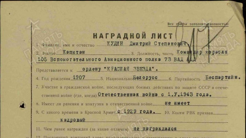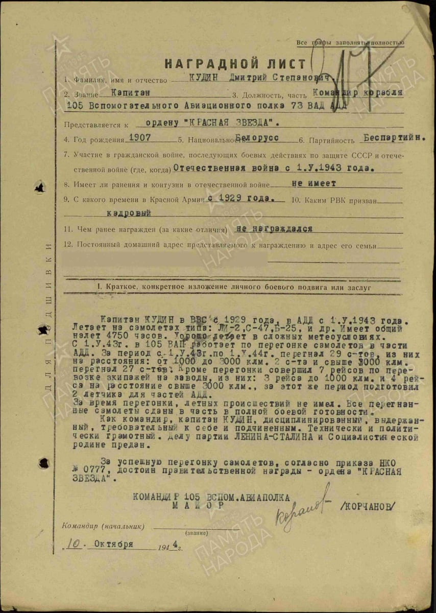«За период с 1.V.43 г. по 1.V.44 г. перегнал 29 самолётов, из них на расстояния: от 1000 до 3000 км — 2 самолёта, свыше 3000 км — 27 самолётов. Кроме того, совершил 7 рейсов по перевозке экипажей на заводы: 3 рейса до 1000 км и 4 — свыше 3000 км. Подготовил 2 лётчиков для частей АДД (авиация дальнего действия — прим.). За всё время перегонки лётных происшествий не имел. Все самолёты сданы в части в полной боевой готовности. Как командир, капитан КУДИН — дисциплинированный, выдержанный, требовательный к себе и подчинённым. Технически и политически грамотен. Делу партии ЛЕНИНА-СТАЛИНА и Социалистической Родине предан. За успешную перегонку самолётов, согласно приказу НКО № 0777, достоин правительственной награды — ордена «КРАСНАЯ ЗВЕЗДА».