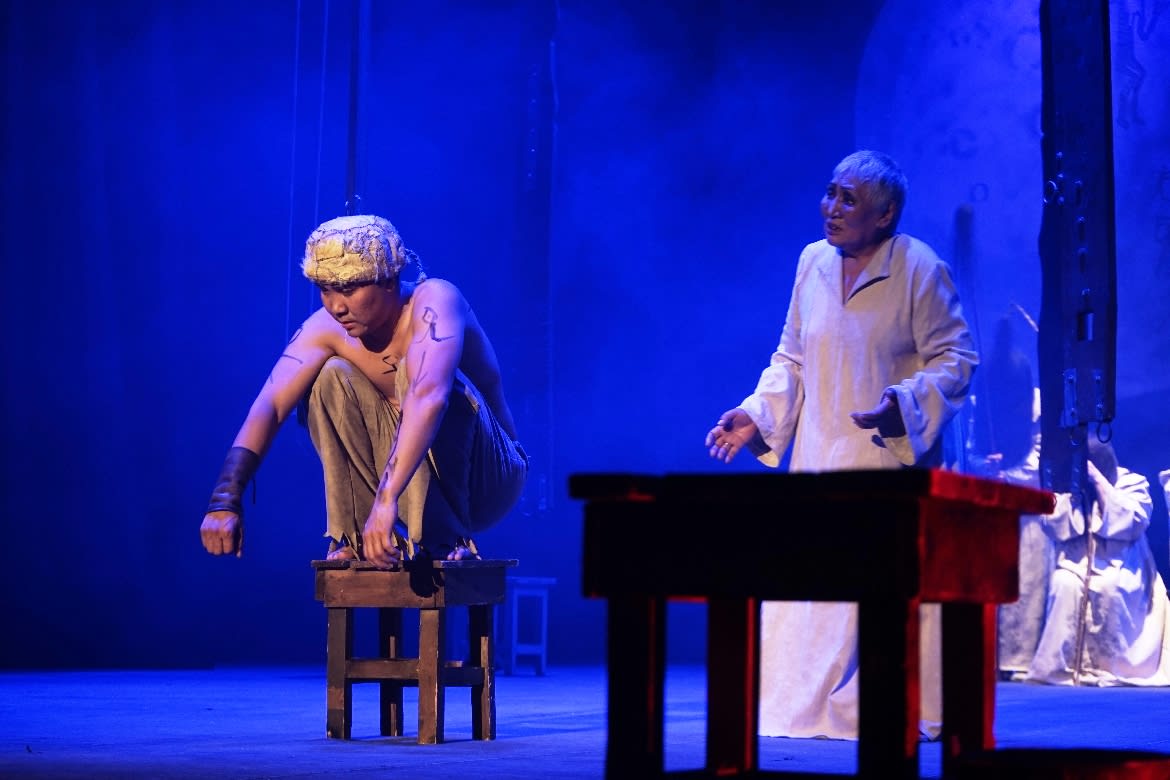 Ткань сценического повествования полифонична, красочна, затейлива. Она соткана не только из айтматовских строк, но включает в себя и поэтические фрагменты Орхоно-Енисейских надписей – памятников древней словесности тюрков, уходящих корнями вглубь веков. Это удивительные образцы архаичной литературы Южной Сибири и Центральной Азии – историко-героические миниатюры, высеченные на могильных стелах у древних курганов, молитвы, плачи, восхваления воинской доблести. Эти удивительные по фонетике и ритму цитаты звучат, как ожившие голоса героев глубокой старины. Их отличает особая мелодичность и сочная звукопись. К тому же и сама алтайская речь напоминает звучание какого-то древнего музыкального инструмента. Речь тюркютов–найманов певуча и душевна, говор врагов – жуань-жуаней — тёмных сил Великой Степи грубый, отрывистый, гортанный. Звуковой срой спектакля, воспринимаемый зрителем в аутентичной природе с переводом через наушник, погружает его в какую-то непостижимую реальность – мифическую, сакральную, завораживающую. Здесь всё пронизано знаками, амулетами, проникнуто тайнописью и магией.