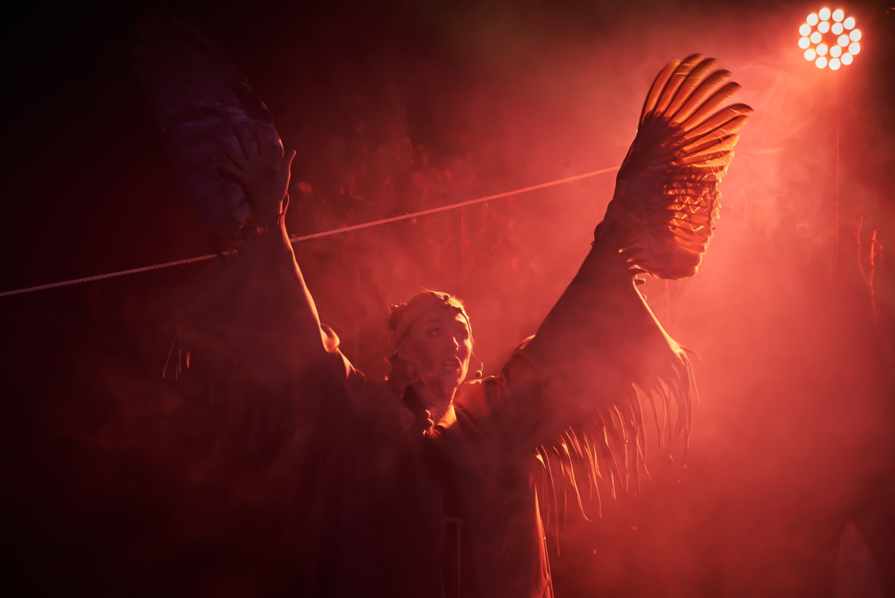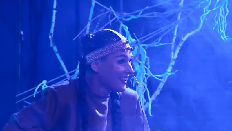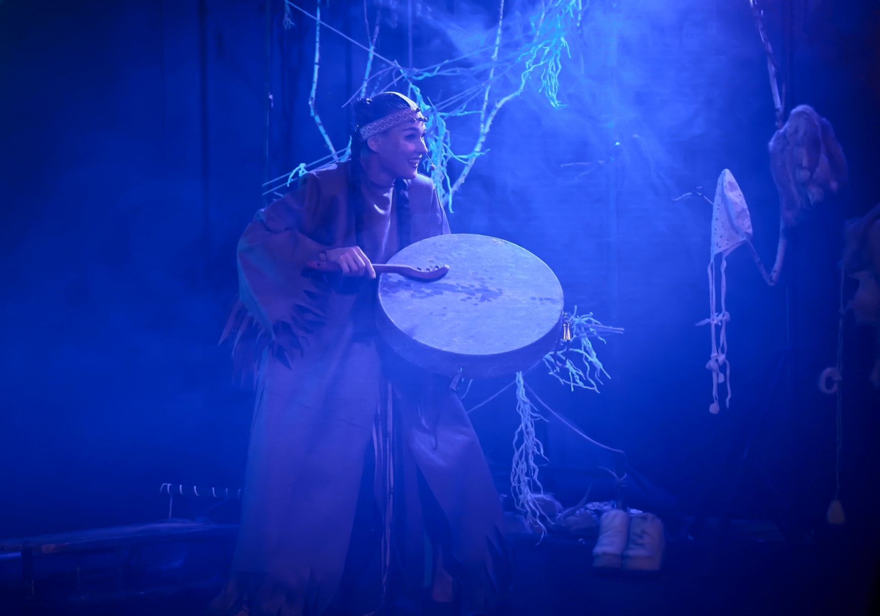 Впрочем, давайте по порядку. Афишное название – не новация иркутского коллектива. Под таким же титулом в Новосибирске идёт постановка в студии творческого развития Константина Хабенского. И так же, как у нас, музыкальную основу фантазийного действа составляют песни автора-исполнителя из Томска Натальи Нелюбовой из альбома «Самана-Кукун», а мифологическую нить – легенды и сказки народов севера. Спектакли очень разные: по фабуле, по жанру, по форме. А название одно. Оно – словно указатель, вектор для концентрации, сказочный клубочек, уводящий зрителя далеко и глубоко. Куда? А ещё точнее – откуда?
