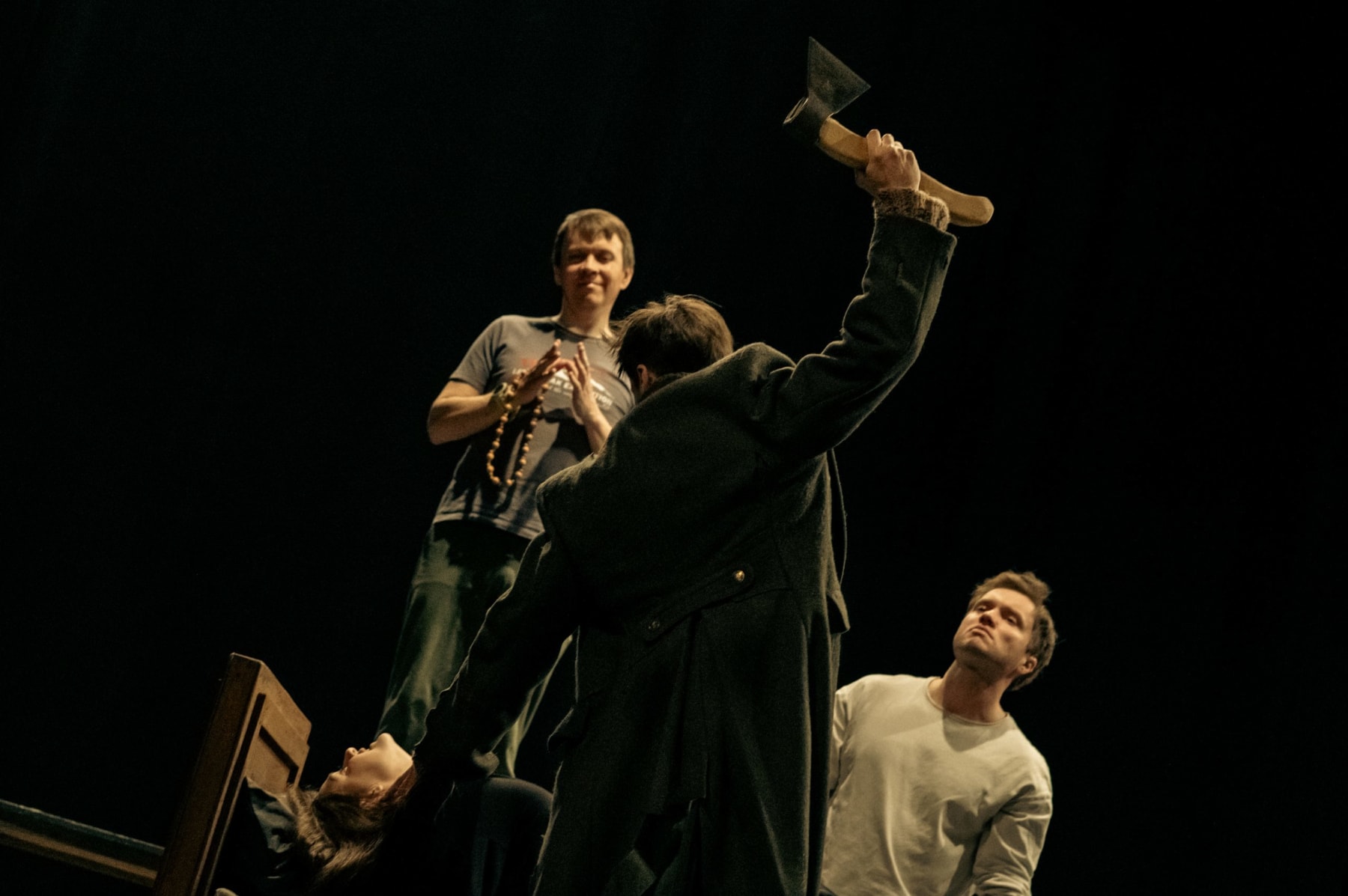 — Конечно. Мы всё-таки показываем взгляд на роман глазами человека XXI века. Человека, уже знающего, что после описанных событий будут первая мировая война, Октябрьская революция, вторая мировая, крушение Советской державы, развивающиеся сценарии новейшей истории. На этом фоне неизбежны отсылки к архетипам, понятным новым поколениям. Так родились новые персонажи — Соглядатаи – внутренние фантомы в сознании Раскольникова, апологеты античеловечности, оправдатели «средств ради цели». Среди них примечательные исторические фигуры: римский легионер, эсесовец, иезуит. Рядом возникает образ Карлика-Наполеона…
