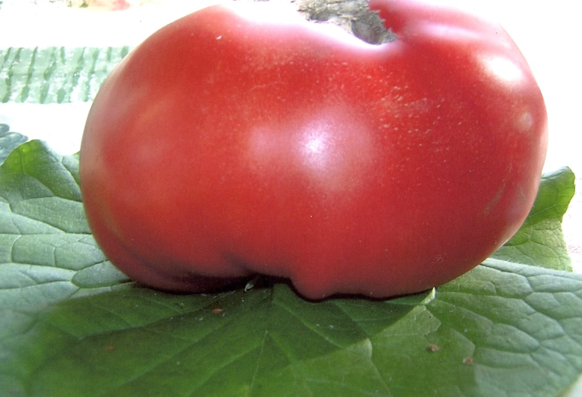 С тех пор этот сорт занимает достойное место в нашей коллекции. Из сеянца получилось мощное, красивое даже без плодов растение. Плоды, конечно же, привлекали к себе внимание ярко-красной расцветкой, округлой формой, внушительным размером. Поскольку даже в сентябре, вопреки рекомендациям, за своими томатами ухаживаю, как и в июле-августе, уделяя внимание регулярным поливам, проветриванию, пасынкованию, внекорневым подкормкам, защите от болезней, так что гиганты дают полноценные плоды, включая пятую и шестую кисти.