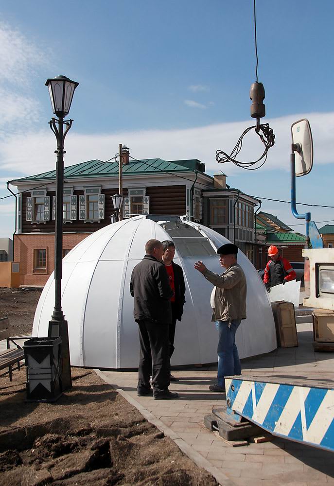 Когда журналисты прибыли на площадку, там уже стоял кран. Купол лежал на земле, ждал своего часа. Руководитель проекта «Ноосфера» Фонда содействия сохранению озера Байкал Дмитрий Семёнов забрался повыше – снять на видео исторический процесс. Рядом по площадке бегал Сергей Язев с фотоаппаратом. «Вовремя приехал, – написал он в своём ЖЖ. – Сегодня утром я прилетел из Петрозаводска, Москвы. Выяснилось, что сегодня в 15.30 к зданию строящегося иркутского планетария подойдёт кран и ориентировочно в 16.00 будет осуществлено водружение купола будущей обсерватории на верхнюю часть здания».