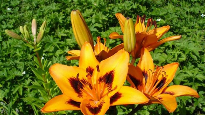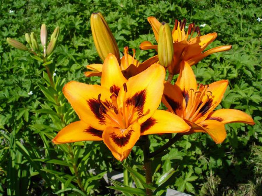Лилии АГ сейчас стали больше по размеру, некоторые достигают 20 см в диаметре и дают до 15 бутонов на стебле. Лепестки тоже стали прочнее, чем у лилий Киреевой. Появились махровые азиатские лилии, у которых не шесть стандартных лепестков, а гораздо больше. Жёлтая Фата Моргана, красные Сфинкс и Черес, розовая Афродита имеют хорошую махровость, устойчивы в культуре и в наших условиях цветут ежегодно (в том случае, если вы не слишком коротко срезаете цветоносы для букета и луковица получает полноценное питание перед зимовкой). Мне очень нравятся азиатки группы Брашмарк – на чистом основном фоне цветка имеется тёмная метка, которая очень украшает цветок. Лучшей из Брашмарков считаю лилию Лоретто, которая при мощном стебле высотой более метра даёт 10-12 крупных оранжевых цветков с бордово-коричневыми пятнами. Цветы направлены вверх. Лилия смотрится очень импозантно, для букета достаточно одного растения. Также очень хороша белая с вишнёвым пятном Патриция Прайд. В последнее время появилась среди азиаток новая группа – Танго. Она отличается обильным мелким крапом по всем лепесткам: жёлтая с коричневым крапом Латвия, белая с лиловым крапом Фанни Гёрл и другие.