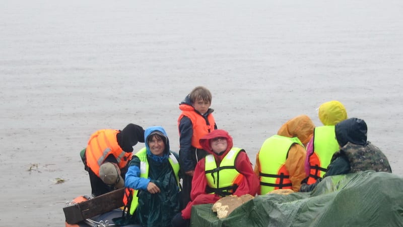 Катамараны на Северном Байкале очень популярны. Когда по сложному пути идут большие группы, катамараны используют для перевозки рюкзаков, продуктов, общего снаряжения. Они плывут параллельно пешему маршруту. С утра капитан Андрей погрузил на катамаран весь груз, посадил Алёну с маленькой дочкой, и они поплыли на остров Миллионная тонь – готовить обед. Оставшаяся часть команды прошла половину острова и стала на его восточной оконечности ждать, когда за нами придёт катамаран. Милое утро сменилось дождём и ветром. Приплыв на Миллионный, мы обедали наскоро, поскольку нам предстояло переправиться на материк – на кордон Нижнеангарского заказника, в местность Дагары. Все десять человек одновременно с грузом на катамаран поместиться не могли, поэтому решили сделать два рейса.