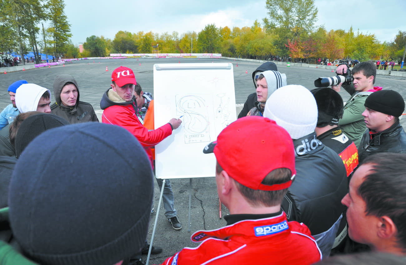 «Давайте вести себя как спортсмены, а не как гопники, которые пришли, сели семечки пощёлкать и друг с другом пообщаться, – обращается главный судья состязаний красноярец Сергей Калюжнов к пилотам, собравшимся на брифинг перед заездами. – Люди пришли посмотреть на дрифт, и это шоу для них делаете вы». Встреча проходит промозглым субботним днём, когда к температуре около пяти градусов выше нуля для полноты неприятных ощущений добавляются холодный ветер и мелкая морось. Несмотря на далеко не самую благоприятную погоду, желающих посмотреть на машины, едущие боком, находится немало. И об их безопасности позаботились так же, как на серьёзных официальных соревнованиях по автоспорту, – обозначенная оранжево-белыми конусами трасса огорожена бетонными блоками, которые отделены широкой полосой земли от ограждения для зрителей.