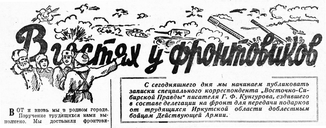 Среди всех подарков, привезённых нами, одним из самых дорогих для фронтовиков оказался номер «Восточно-Сибирской правды». Газету читали в штабах, походных госпиталях, фронтовых клубах, в блиндажах и землянках. Она быстро проникла на передовую линию огня. Её жадно читали разведчики, автоматчики, танкисты, артиллеристы, лётчики.