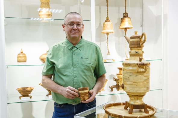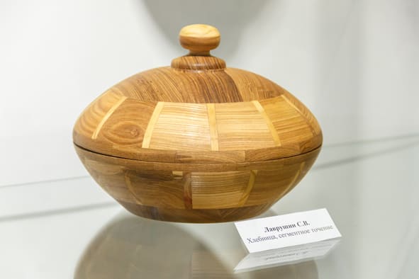 Деревянные изделия – менажницы, колокола, кувшины, подсвечники и даже самовар – привёз на выставку в Иркутский городской выставочный центр имени Рогаля мастер из Саянска Станислав Лаврушин. Он работает в технике сегментного точения. Что это за способ изготовления предметов, какую древесину использует мастер – об этом читайте в нашем материале.