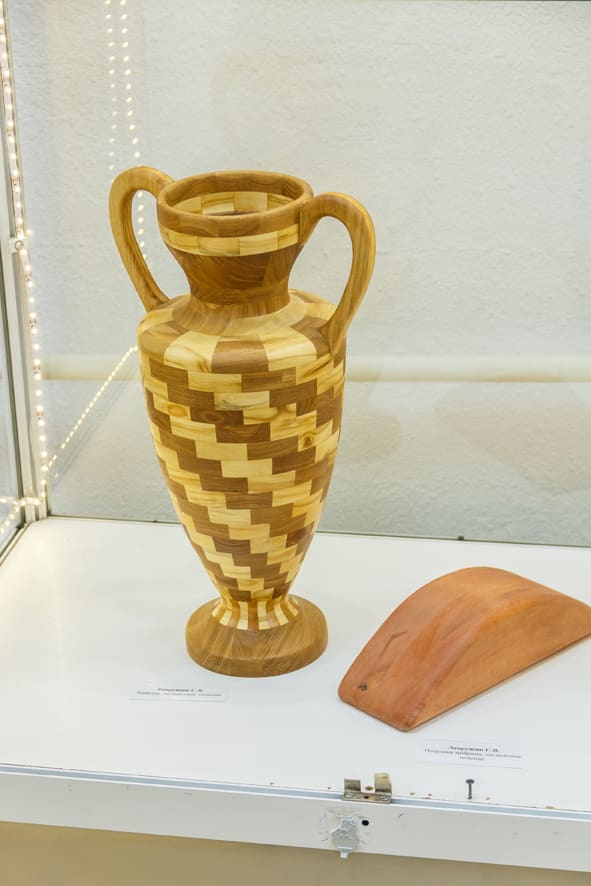 «Сосну, например, для самовара использовать нельзя, она со временем разбухнет, да и полируется не так. А вот обратите внимание на вазочку – она из груши, и тоже чуть-чуть клёна добавлено. В основном материалы беру местные. Караулю, когда весной городские службы делают санитарные обрезки деревьев в парках, забираю чурки, ветки и с ними потом работаю. В этом кувшине, – продолжает экскурсию по своей выставке Станислав, – рисунок подбирал, чтобы получился в виде спирали, замечаете? Здесь ольха с улицы Дальневосточной, а кедр привёз из Куйтунского района. А в этой разделочной доске выделяются затейливые узоры – это тёмные вставки из акации, обычного кустарника, что растёт у нас часто вдоль дорог. Первый раз его ствол распилил, увидел рисунок дерева – это потрясающе, решил использовать!»