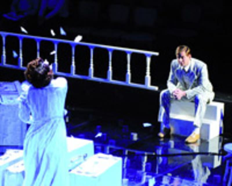 Белые декорации залиты ярким светом. На сцене появляется актёр в светлом костюме, длинном белом пальто. Он начинает говорить, делая длинные…