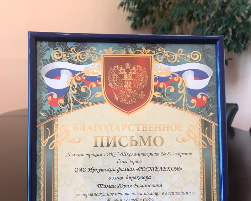 Руководитель автономной некоммерческой организации (АНО) «Иркутский центр абилитации» Серафима Мельник вручила благодарственное письмо директору Иркутского филиала «Ростелекома» Юрию Тиману за поддержку…