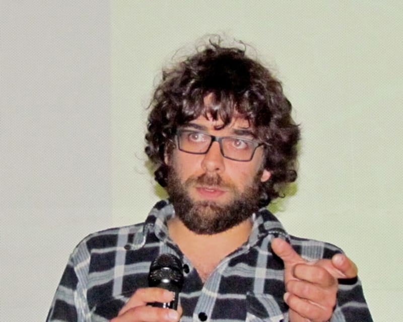 Леонардо Йамас, симпатичный лохмато-бородатый молодой человек из Испании, смущённый всеобщим вниманием, стоит на фоне белого экрана в большом зале Дома…