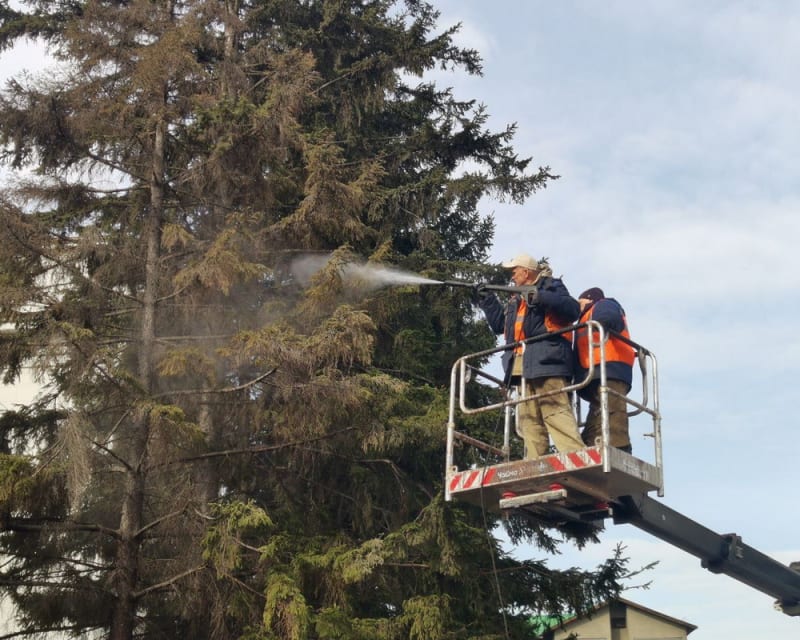 – За зиму на кронах хвойных деревьев оседает пыль. Для того, чтобы дерево лучше росло и на нём не появились…