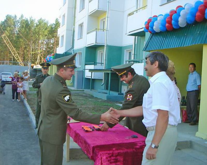 Придомовая площадь встречала гостей тёплой солнечной погодой, военным оркестром, гирляндами разноцветных шаров над подъездами заселяемой девятиэтажки и, конечно же, взволнованными…