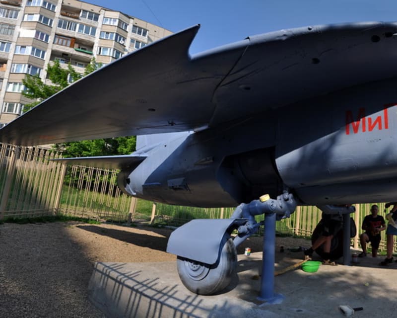 Солнце, прежде чем скрыться за девятиэтажкой, бросает закатные лучи на выкрашенный в серый цвет МиГ-23Б, стоящий рядом со зданием Музея…