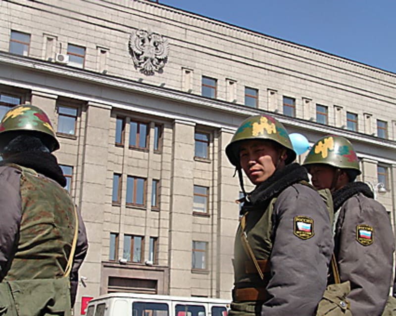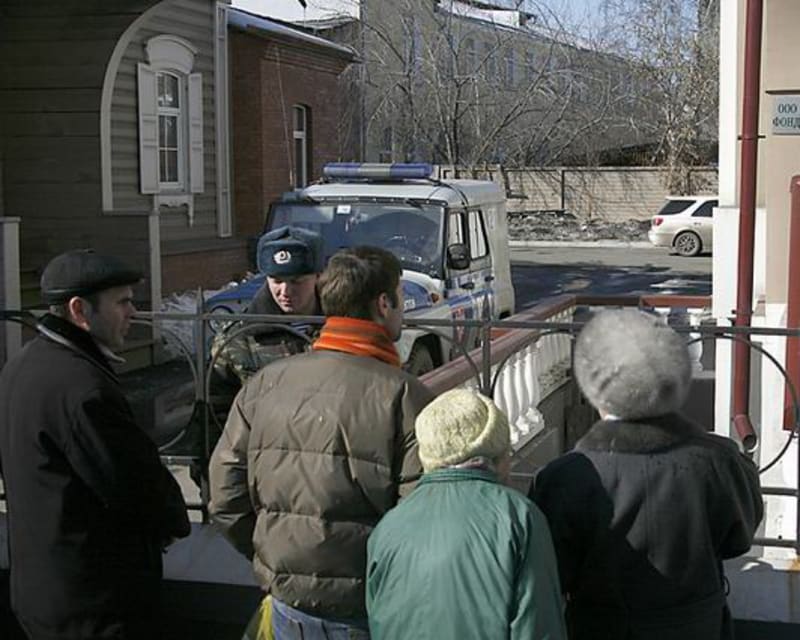 Первыми, кто встречал входящую во двор сносящейся трёхэтажки прессу, была группа быстрого реагирования службы судебных приставов в камуфляже, чёрных вязаных…
