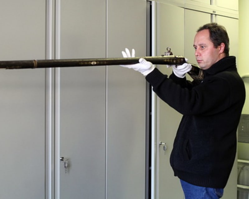Научный сотрудник ИОКМ Сергей Шуперт осторожно берёт в руки ружьё. Как всегда, обязательны перчатки – ружьё около трёх лет назад…