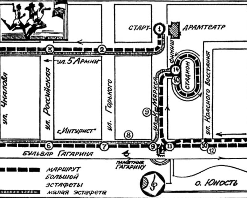 1--7-й этапы -- по маршруту малой эстафеты. 8-й этап -- от памятника Гагарину до памятника Александру III (300 м). 9-й…